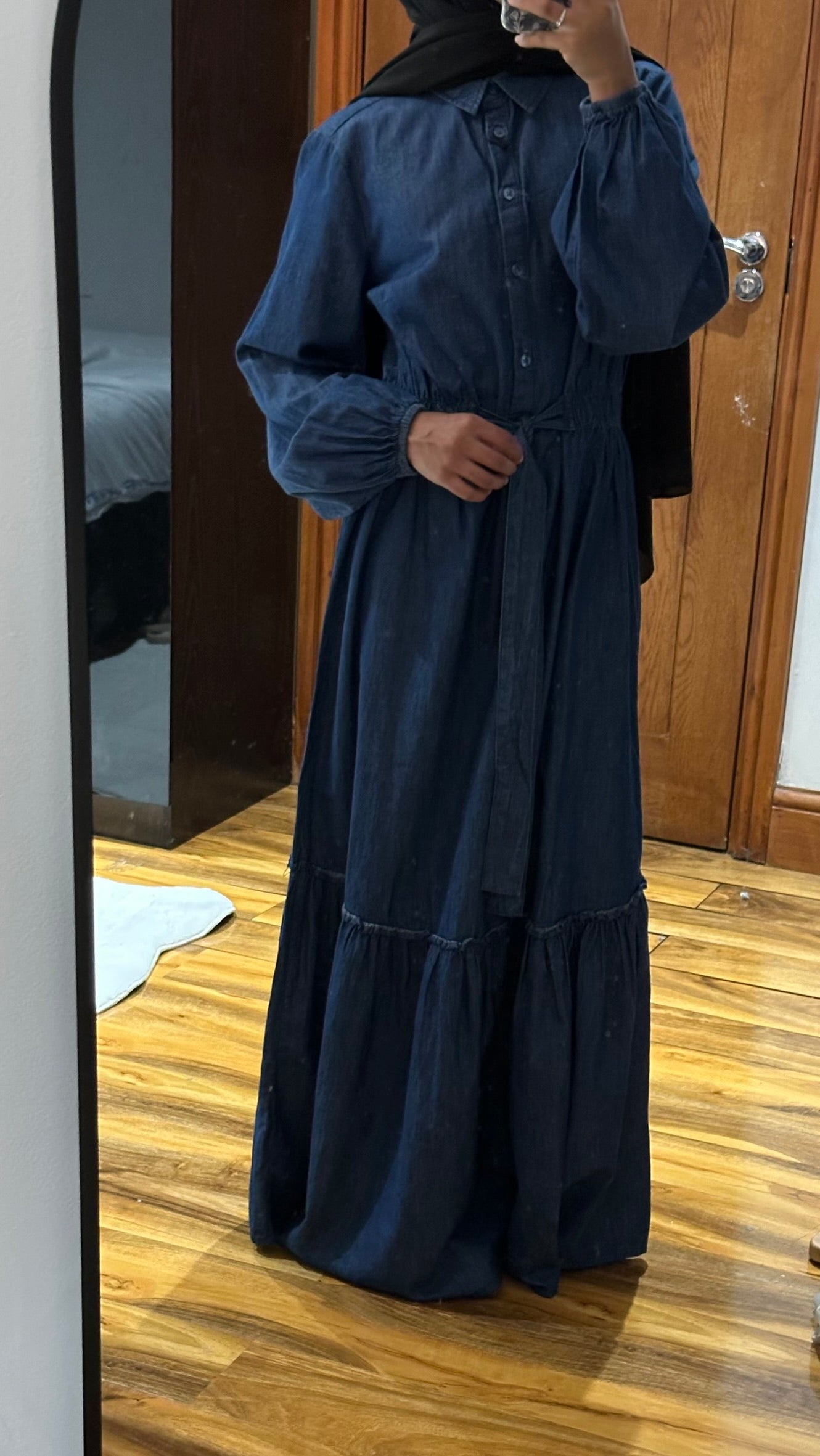 This full-length denim dress features soft elasticated sides for a comfortable, flattering fit, a tie-front detail, and a tiered bottom that adds style. It features a a collared neck as well as elasticated sleeves too. The fabric drapes beautifully, making it perfect for everyday wear or those days you want to dress up.