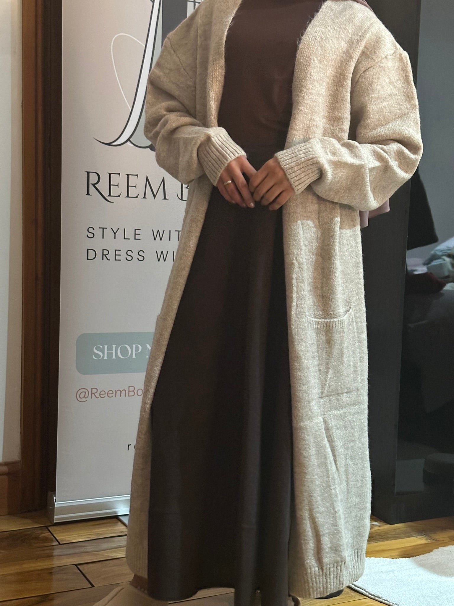 This open cardigan is crafted from soft wool and features square pockets, adding practicality and warmth. Perfect for layering over co-ord sets, dresses, or jeans, its a versatile piece that brings style and comfort to everyday outfits.