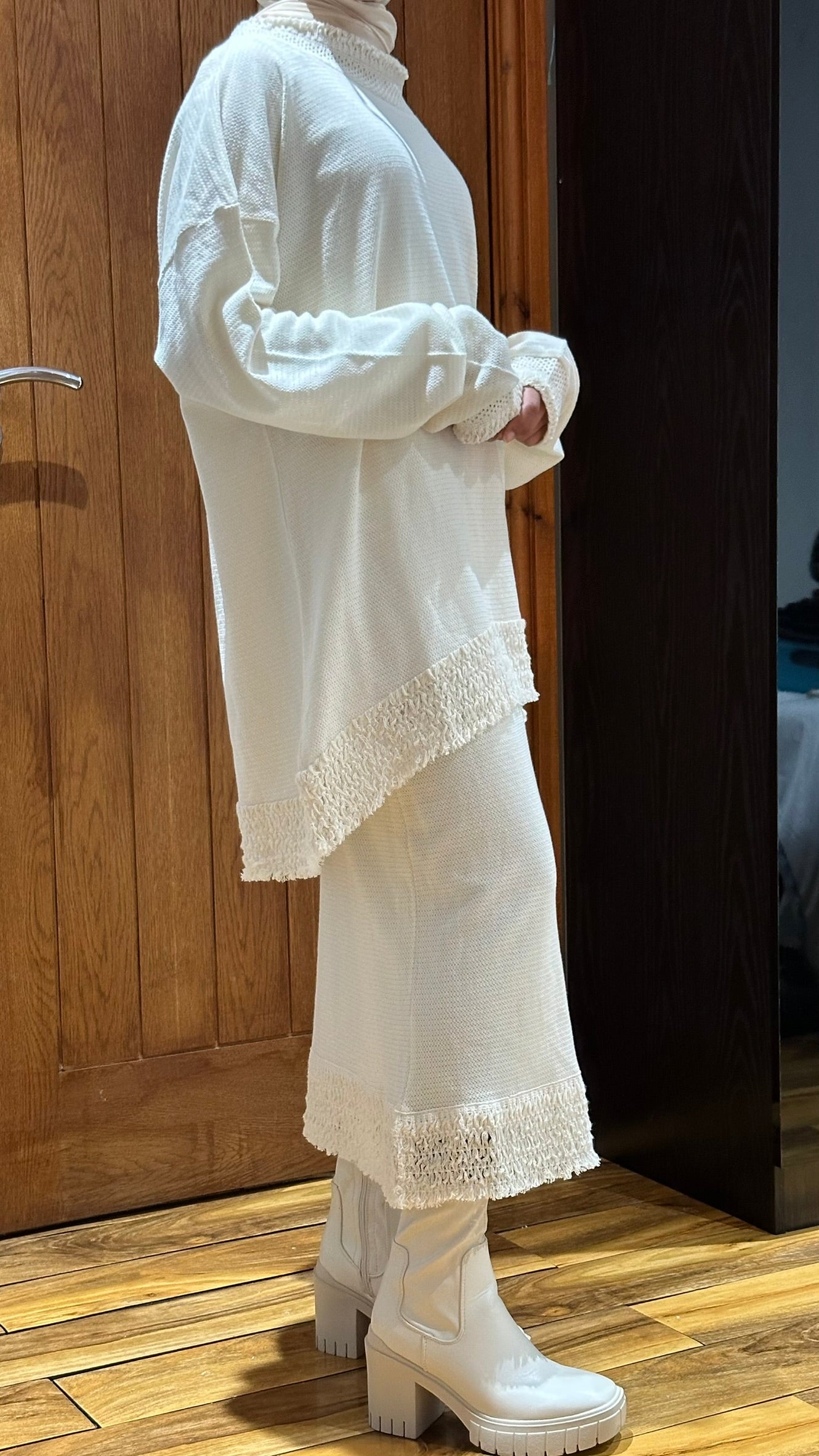 This knitted co-ord set includes a loose-fit top with delicately detailed sleeves and refined finishes, paired with a matching skirt for that elegant look. The knit offers gentle stretch, comfort, and a premium fit that flatters without clinging. Paired with your favourite boots, it'll be your favourite outfit!