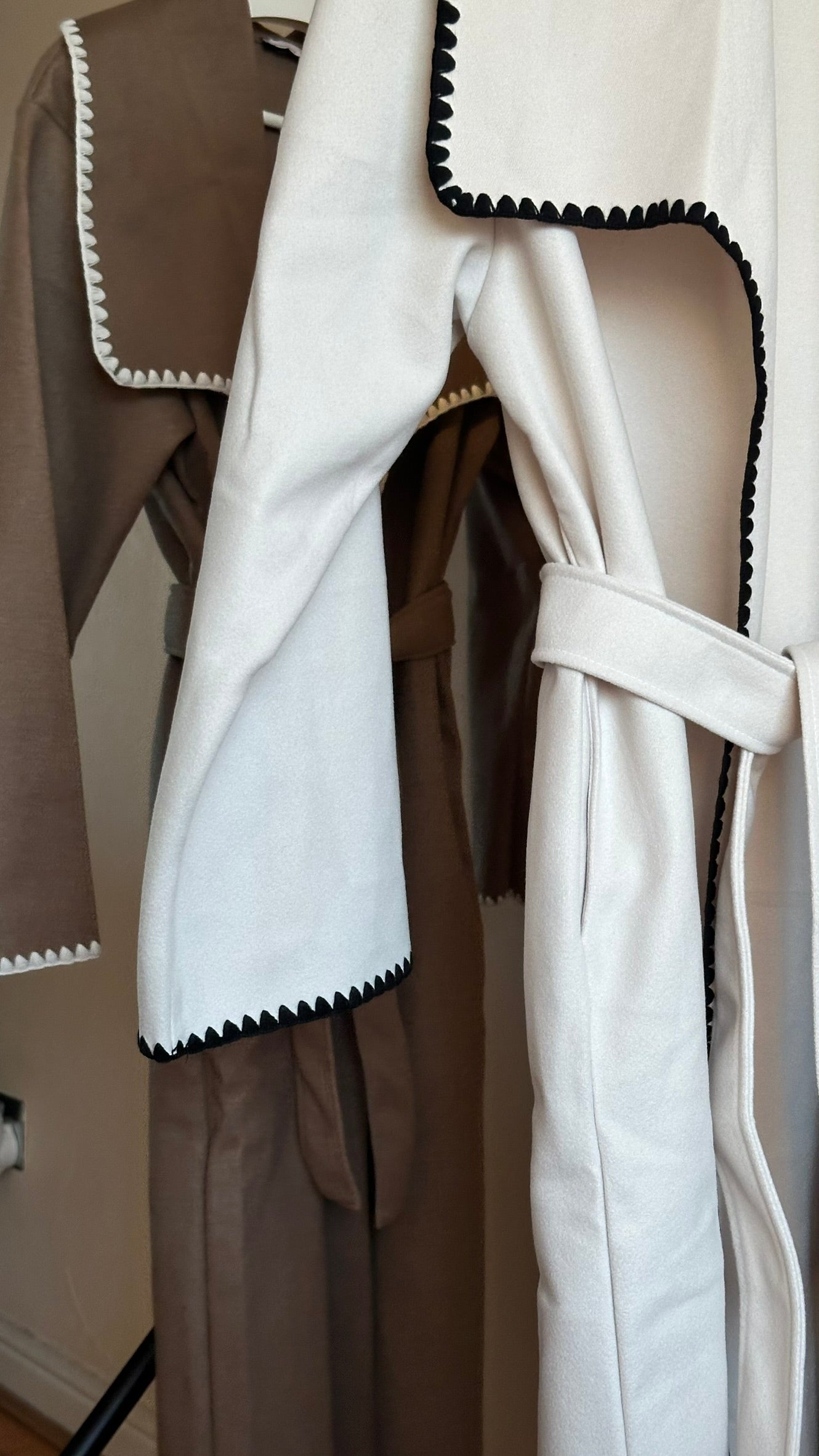 This open-front coat is crafted from super-soft touch fabric and features delicate scallop stitching along the borders. adding a subtle, elegant detail. The wide collar enhances that sophisticated look, while a matching belth allows you to cinch at the waist or wear it relaxed. Perfect for layering over dresses, co-ords, or trousers. It combines comfort, elegance and modest style.
