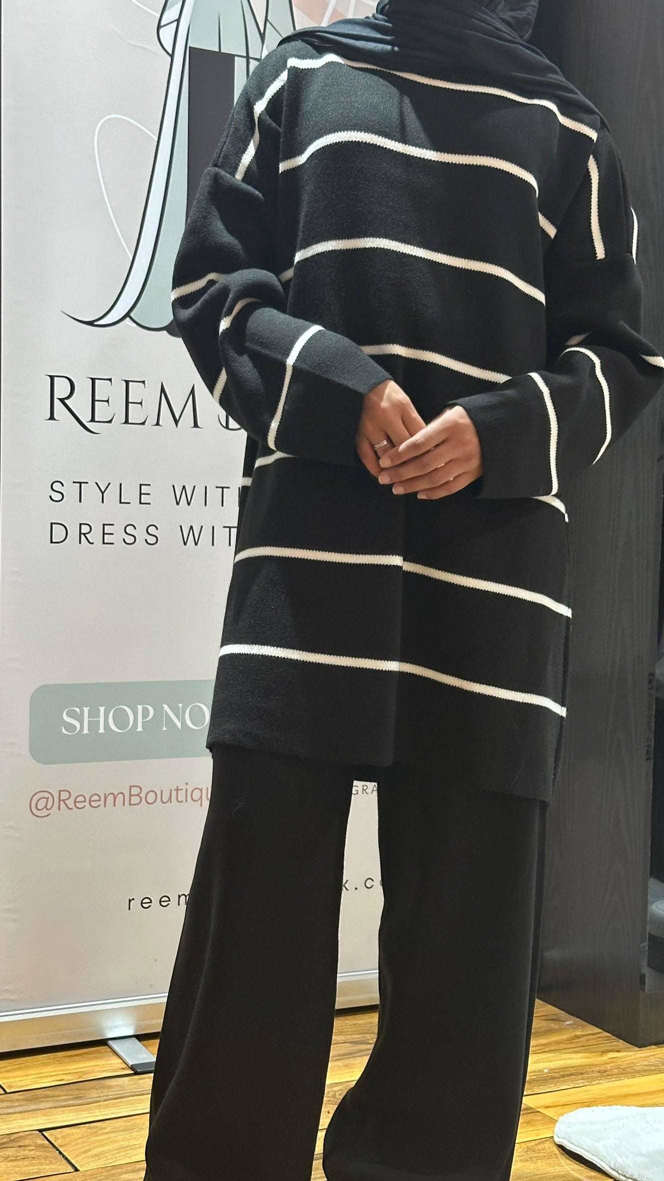 This co-ord set features a soft knit with horizontal striped detail for that added paired with plain wide leg trousers for an easy everyday look. This knit offers a gentle stretch while keeping it modest and comfortable.